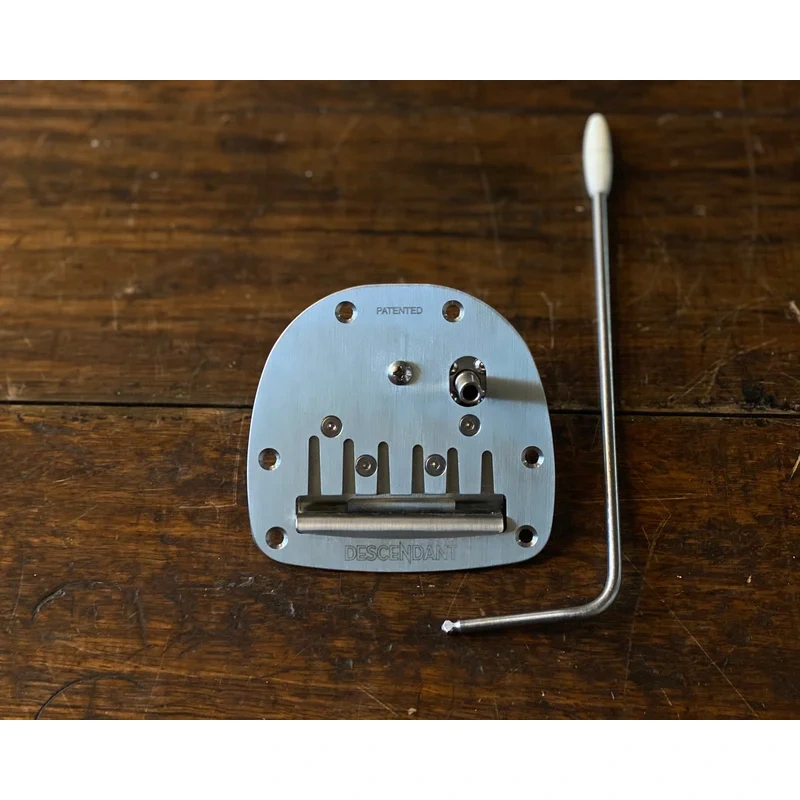 Replacement upgrade vibrato for Jazzmaster's and Jaguars with unique countersunk screws, top accessible adjustable swing arm tensioner & patented depth string plate for increased downward tension of the strings on the bridge's saddles so they stay in t