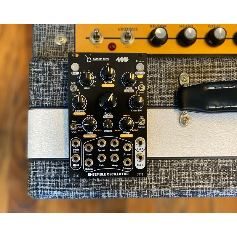 By quantising the oscillators to scales or series of harmonics, the Ensemble Oscillator allows you to explore the sonic boundary between musical chords and rich evolving textures. Easily create a wide variety of sounds ranging from aggregates of pure sine waves to pulsar synthesis or pristine harmonic tones and lush wide chords to rich dirty drones and rumbling glitches. Custom scales can quickly be learned and saved using a CV keyboard or by manually entering notes with the controls.