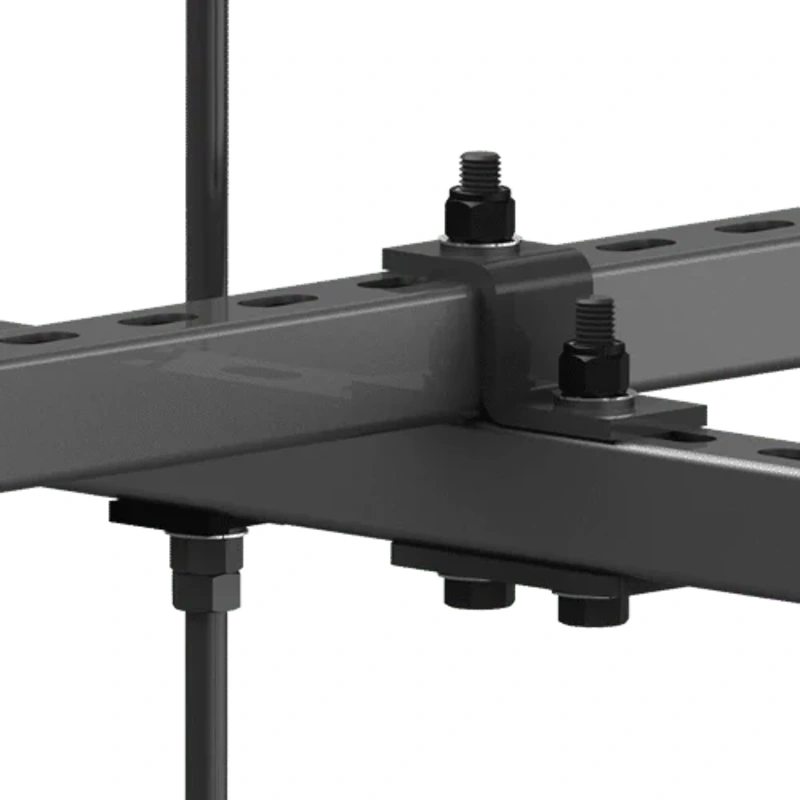 This complete cross-over kit provides all the necessary hardware to clamp two channel strut sections together perpendicularly, one over the other. This kit allows for a fast, secure method of clamping these structural sections together to assemble larger fabrications. Non-loosening and sound isolated hardware is included to assure a firm, long lasting and sound dampened connection.