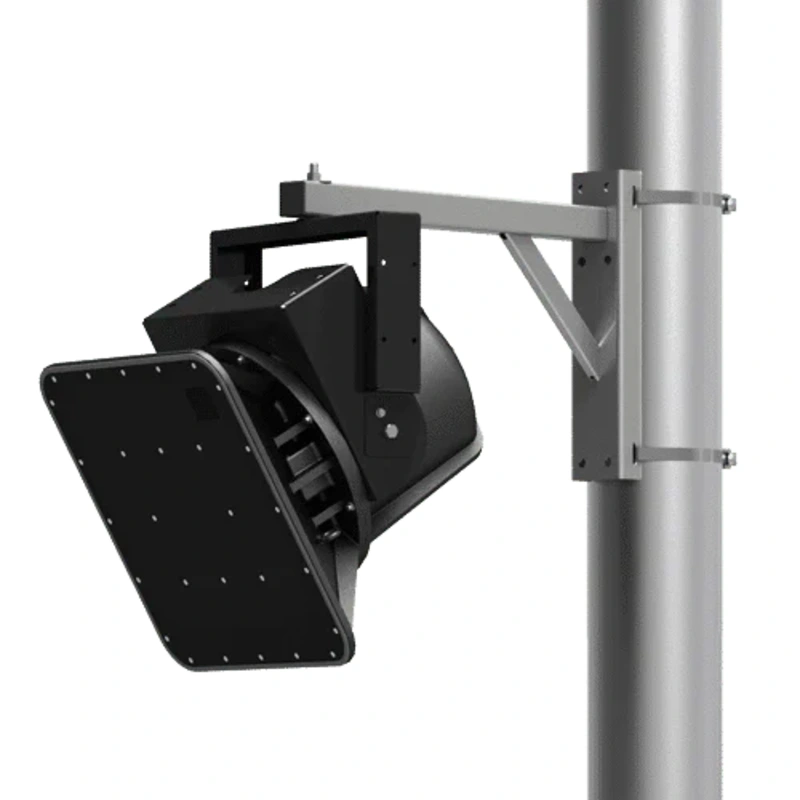 The support arm is welded together for extra strength and durability. Each arm includes three attach point mounting holes at the end of the arm that allow the installer to select the desired distance between the loudspeaker and the pole.