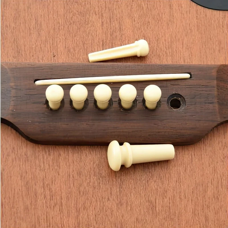 Plain "aged" cream, authentic slotted replica pins as used on L & J model Gibson guitars from 1938-1941. Set includes six bridge pins and one endpin. Bridge pins have a 7.85 mm head diameter, 5.74 mm cone diameter & 5 degree taper. Imported from Ge