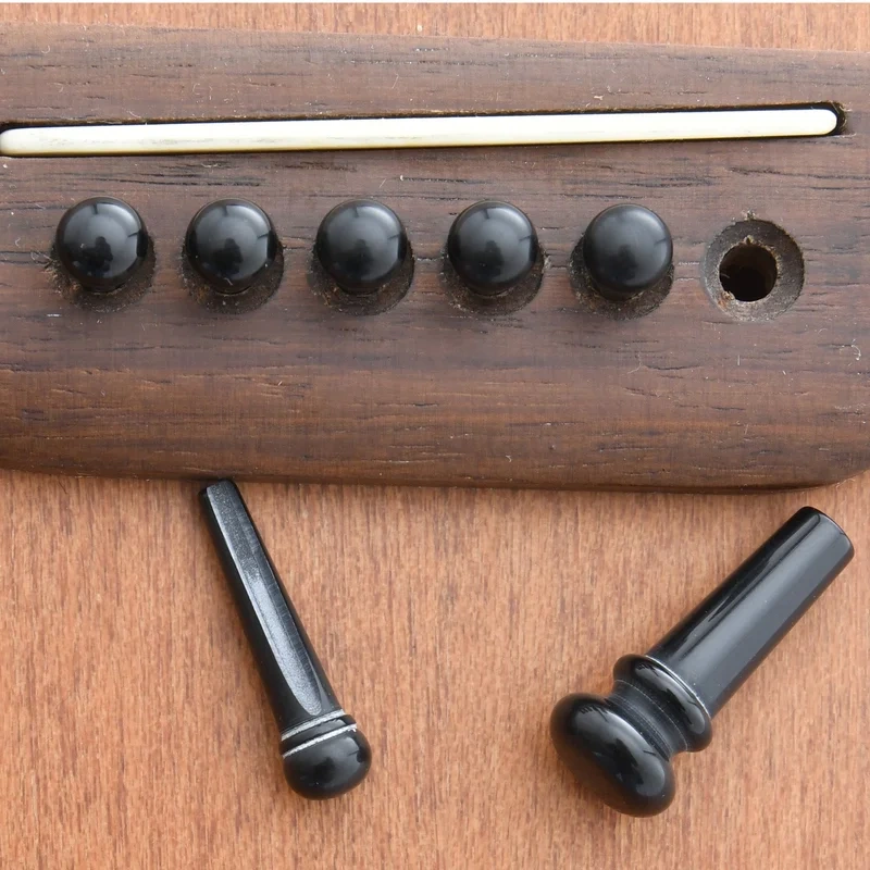 Plain black, authentic slotted replica pins as used on LG-0, LG-1, LG-2 & J-45 model Gibson guitars from 1946-1970's. Also used on 1930's Larson Brothers guitars. Set includes six bridge pins and one endpin. Bridge pins have a 7.6 mm head diameter, 5.6