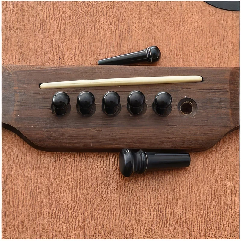 Plain black, authentic non-slotted replica pins as used on style 15, 16, 17 & 18 Martin guitars from 1943-1970's. Set includes six bridge pins and one endpin. Bridge pins have a 7.6 mm head diameter, 5.6 mm cone diameter & 5 degree taper. Imported