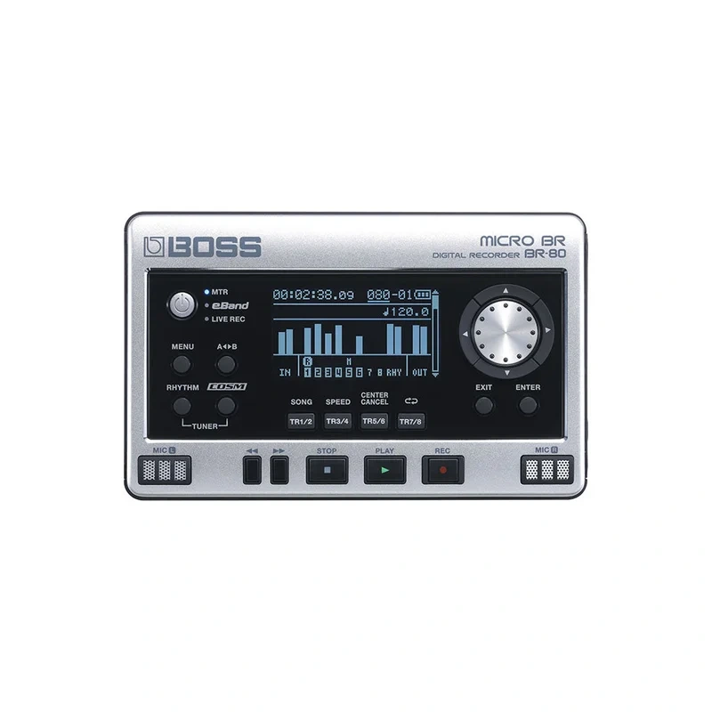 Small enough to fit in your pocket, the BOSS MICRO BR BR-80 is the ultimate new portable recording and jam-along tool for guitarists and other musicians. Its equipped with three modes to create, record, and perform your music: an eight-track MTR (Multi-Track Recorder) mode; an eBand mode for onstage backing tracks and phrase training; and a Live Rec mode for instantly capturing high-quality stereo recordings. You can even combine the three modes seamlessly. Record your phrase ideas using Live Rec mode, for example, and then import the recordings into MTR mode to use as foundations for song production. Once youve added tracks, import your finished songs into eBand mode for backing-track accompaniment at the gig. The MICRO BR BR-80 is truly a must-have for all musicians!