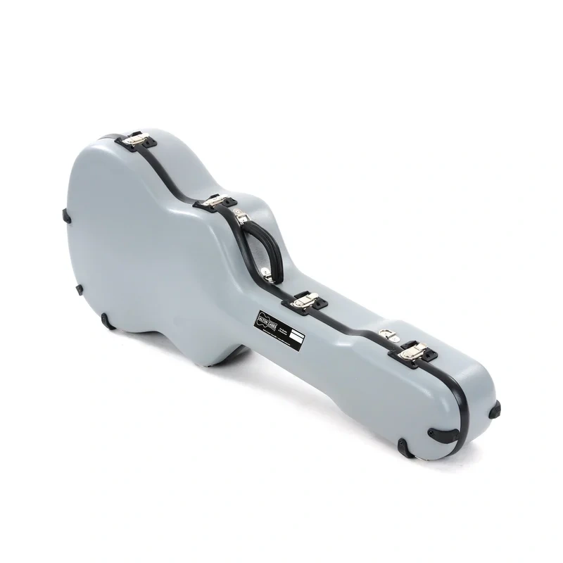 Extra heavy-duty fiberglass shell in gray with black interior lining, custom padded to fit a Martin or Collings 14-fret 000 / OM precisely. Case also features locking latch, bumper guards, textured finish, a comfortable handle and shoulder strap.