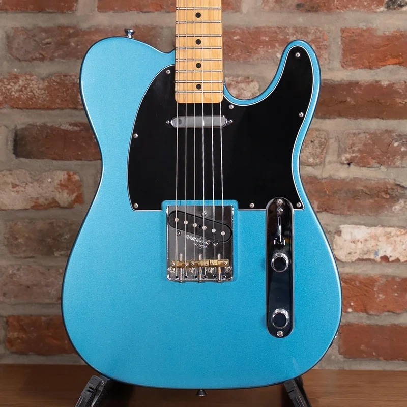 This is a 2010 Standard series Fender Telecaster featuring an alder body and C-shaped maple bolt-on neck with a maple fingerboard. The construction of these Mexican-made Telecasters is historically optimal for artists to modify and upgrade to their liking. For example, this Telecaster came to us with an aftermarket 3-ply black pickguard and Wilkinson WTB brass compensated 3-saddle bridge installed by its previous owner for improved intonation. The metallic Lake Placid Blue finish has just a couple of discreet nicks from regular use, giving the classic color some authentic worn-in character. A workhorse guitar previously used for gigging in NYC, Boston, and Philadelphia, this piece is in solid shape and ready for its next chapter; on stage, on the road, or at home. Includes SKB TSA-approved universal hard shell case.
