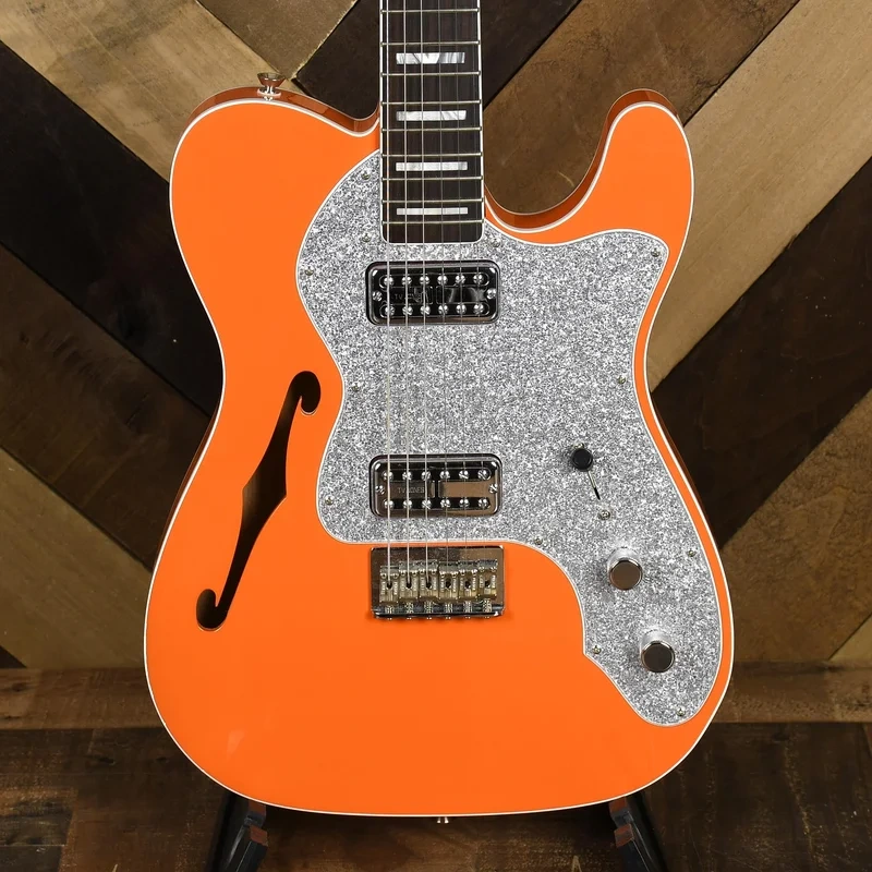 This Super Deluxe Thinline Telecaster can be seen on stage in any scenario. By "seen on stage" we mean physically seen from the back rows! Its TV Jones pickups are crystalline, and what would conventionally be a tone knob is a bass rolloff control to emula