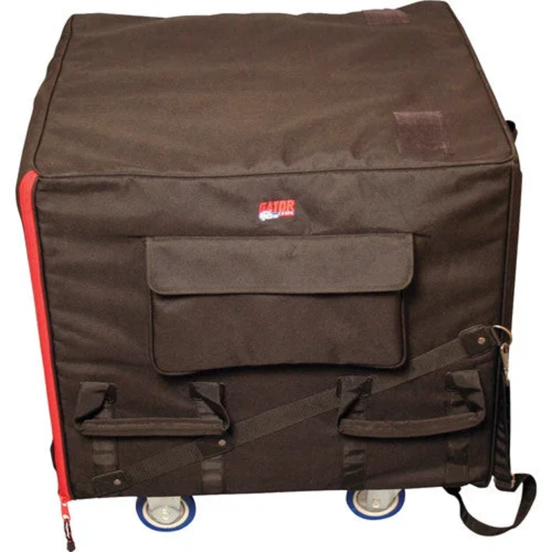 TheGator Case G-SUB 2224-25 Rolling Sub-Woofer Speaker Bagis a nylon slip-on bag with caster board made to transport a powered sub-woofer speaker. It has two protective skid bars and two external pockets for cables and accessories. The bag is transported b