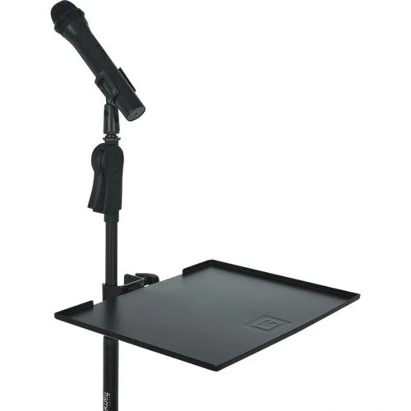 The 11 x 15"Gator Frameworks Large Microphone-Stand Accessory Shelfeasily clamps to your mic stand to keep large accessories ready during your shows or rehearsals. Featuring a rugged, black, powder coated steel construction, it can securely hold a laptop o