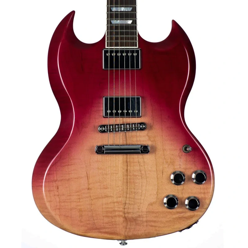 The SG Standard HP is a classic SG double-cutaway style guitar with the new twist of an elegant AA figured maple top added to the traditional solid-mahogany body and neck. Featuring advanced materials including titanium adjustable zero fret nut and bridge saddles for improved performance, next-gen G FORCE tuners, frets over binding, soloist neck width, and fast-access heel. Immense tones are driven by two humbucking pickups with DIP switch and 2 push-pull top hats, appointed with eye-catching chrome knobs. A slightly thicker body provides for more precise weight offset and overall improved balance in the guitar.