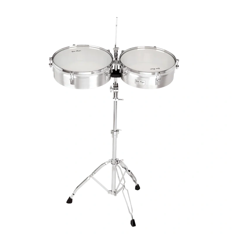 Designed with legendary timbalero Orestes Vilato, these finely crafted drums are a real joy to play! From their simple, elegant design all the way through to the sturdy supplied stand, quality underpins every aspect of these instruments. The 14/15 aluminum shells are a shallow 4 in depth and rolled over at each end for a perfectly flat and level bearing edge. The shallow design allows the drums to be stacked and transported in a standard snare drum case, which coupled with their light weight, makes them extremely portable. The shallow shell design also allows you to reach under and play inside the shell, a classic Orestes Vilato technique! Each shell features five tuning points: a simple bracket designed to house the chunky, recessed tuning rods, with supplied tuning wrench to increase or decrease tension. The thin, authentic feeling heads are held in place by perfectly round, pressed-steel hoops. In addition, the included sturdy, double-braced stand offers large wing nuts for quick, easy adjustment, and large memory locks to hold everything securely in place. The shallow, lightweight aluminum shells produce deep rich tones to accompany their initial bright, clear attack. Rim shots produce full, warm, loud tones, accompanied by high-pitched overtones, a result of the thin, aluminum shells. The cascara is warm, but loud enough to be heard through any wall of sound!
