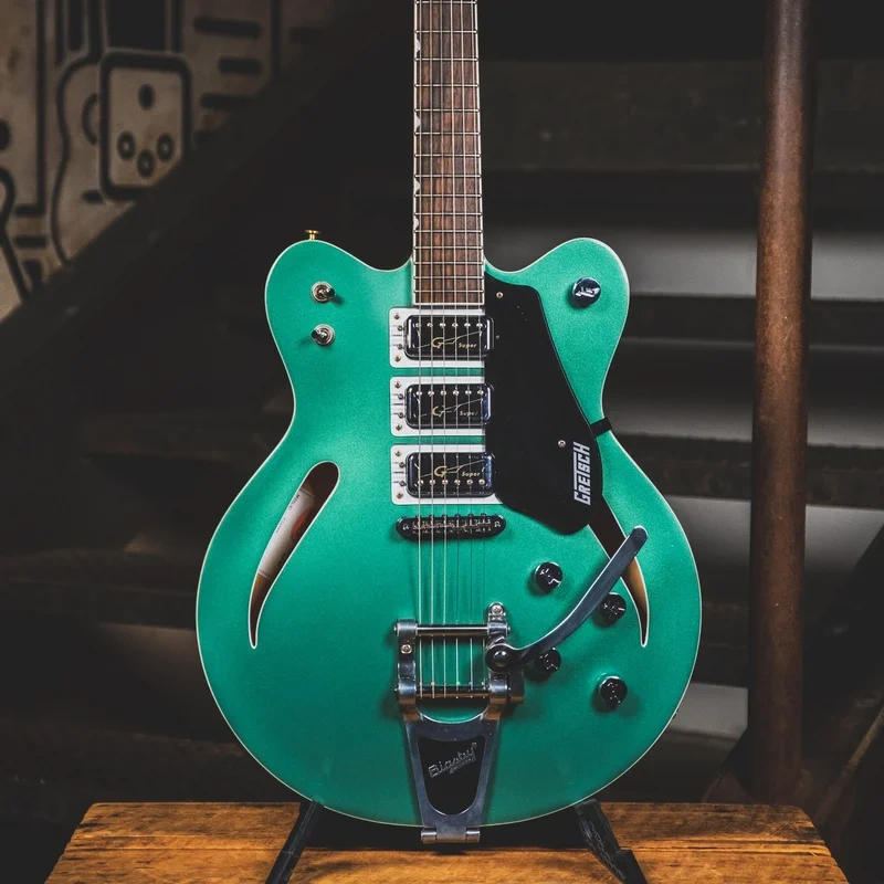 The Gretsch G5622T-CB Electromatic Center Block is 1 3/4″ deep and is built to handle gain without feeding back. These models are known for their 3 Super HilLo’Tron pickups that are clear and punchy.
