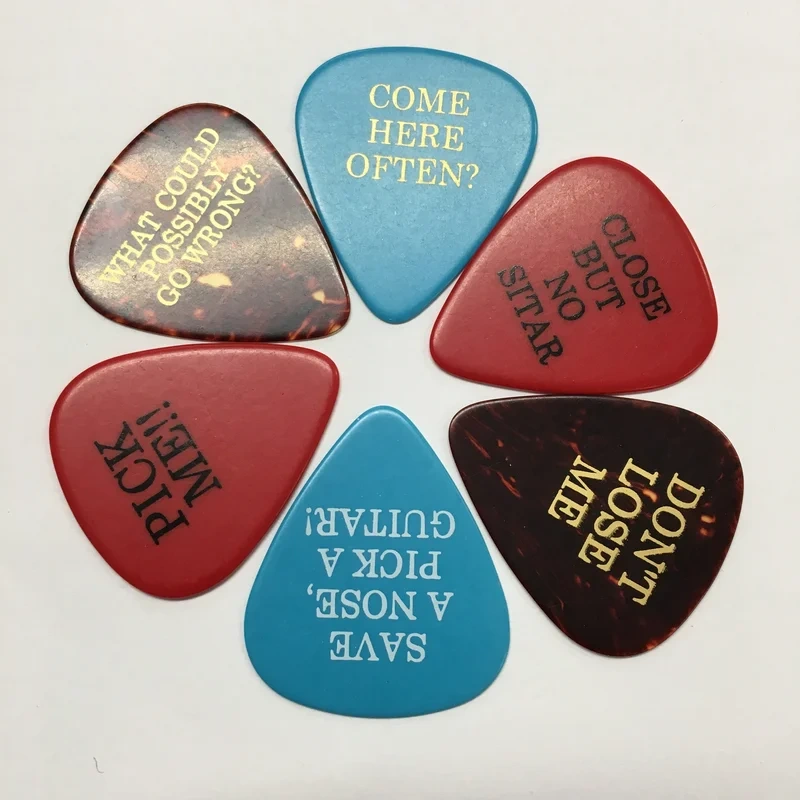 A decades-long tradition! We've been ordering these picks from Ernie Ball with custom imprints for many years. When you visit our brick-and-mortar shop, these are the famous "pick jar picks" on our front counter. Sold at 6 for $1 - please let us choose an