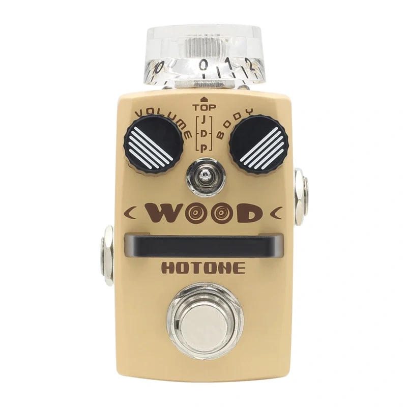 Hotone WOOD is an acoustic guitar simulator stompbox designed for guitarists. If you are tired of carrying an acoustic guitar along to the stage or studio, the compact WOOD pedal is for you. Its wide adjustable range is enough to turn an ordinary electric guitar tone into a variety of natural, realistic acoustic tones. The 3-way toggle switch lets you choose from J (Jumbo), D (Dreadnought) and P (Piezo) simulation modes; the BODY knob and the TOP knob can further shape your tone.