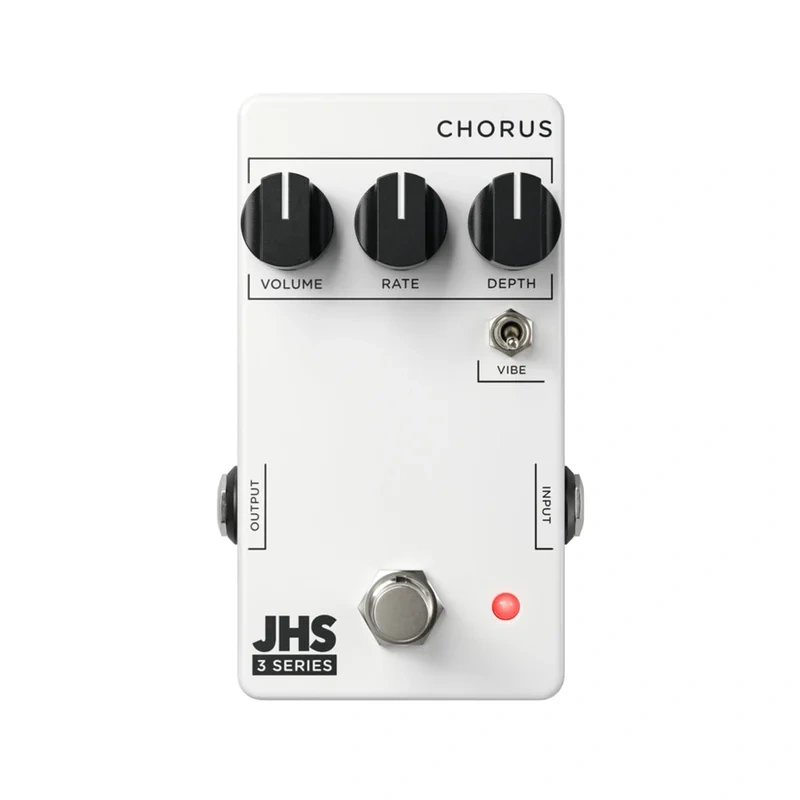 modulation sounds, with straightforward controls and enough versatility for any style of music. The Rate and Depth knobs work together to deliver anything from subtle doubling to utterly seasick waves of modulation. The Vibe toggle removes the dry signal so that you will have a simple true pitch vibrato sound without the dry signal underneath. The JHS Pedals 3 Series Chorus runs on 9V DC Negative Center power, consumes 9mA and measures 4.42 (L) X 2.38 (W) X 1.22″ (H).