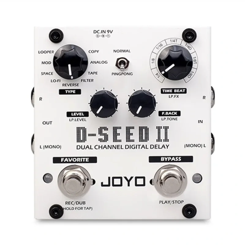 The JOYO D-Seed II is our most feature rich delay guitar effect pedal and combines 8 delay effect types, stereo, ping pong, tap tempo, memory and a looper into one mighty stompbox.In total there are 8 different delay types to select from including:Space -