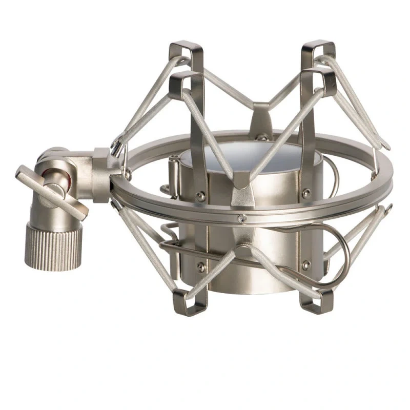 For more professional-sounding recordings, our MY410CG Shock Mount for Studio Mics provides elastic suspension that isolates mics from external rumble. The sturdy adapter mounts to standard mic booms while the suspended clamp securely holds a wide range of large-diaphragm condenser mics. The clamp angle adjusts and locks in place with a tightening knob for precise mic positioning. Cloth lining on the clamp protects the mic finish and delivers a nonslip grip for reliable mic support.