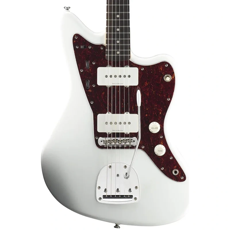 Features include a maple neck with vintage-tint gloss finish, 9.5-radius rosewood Fingerboard with 21 medium jumbo frets and parchment dot inlays, tortoiseshell (Three-Color Sunburst and Olympic White models) and white-black-white pickguards (Candy Apple Red and Sonic Blue models), Jazzmaster single-coil pickups, circuit selector switch and pickup selector toggle switch, white Stratocaster-style control knobs (lead circuit) and black disc knobs (rhythm circuit), vintage-style bridge and non-locking floating vibrato with vintage-style tremolo arm, vintage-style chrome tuners and chrome hardware.