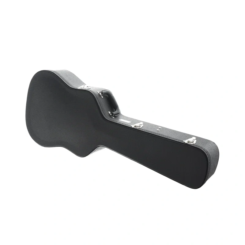 Canadian-made case with shaped wooden shell, arched lid, plush padded interior, rugged textured black covering. Body area contoured to fit 14-fret dreadnoughts, square-shoulder or slope-shoulder types.Long enough for a 12-string.