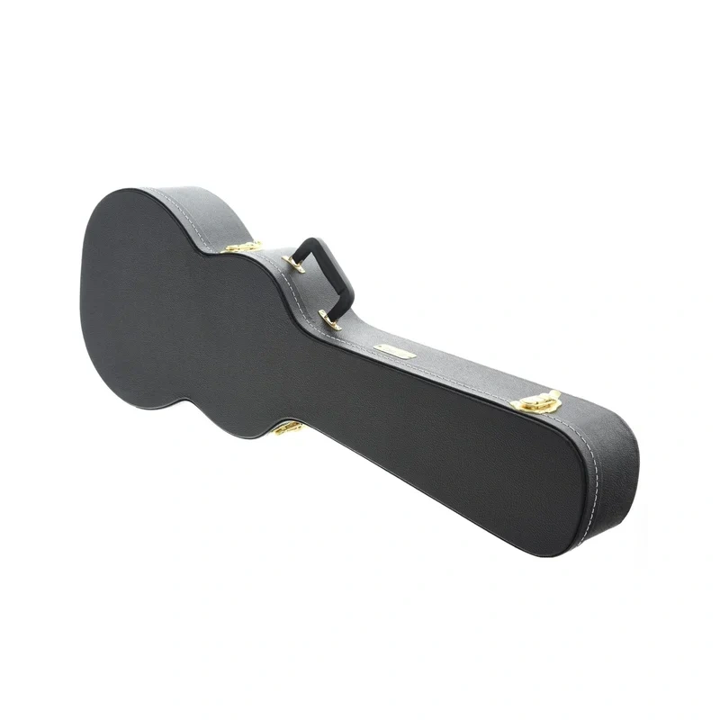 Shaped wooden shell, flat lid, plush padded interior, black leather-look covering. Fits 00 / Classical (14.5" lower bout) guitars.