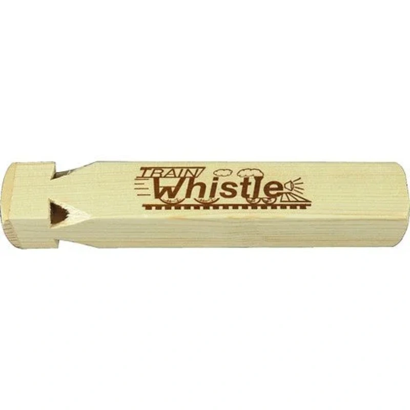 Tritone, all wood. Makes realistic train sounds. Don't blow in the car! Fun for kids.