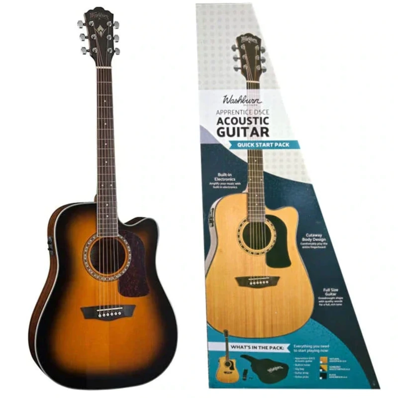 Every journey starts somewhere and the Apprentice is a trustworthy place to begin. Washburns experience ensures you get a guitar that is the perfect balance of stability, tone and cosmetics. It features a premium spruce top with mahogany back and sides for a full rich tone. Those seeking a guitar that sounds great, looks great, plays great and will serve them well as they progress will find the Apprentice series perfectly suited to them. As one begins their journey, protecting your guitar against knocks and scratches is essential. All Apprentice 5 guitars are priced including a hard shell case. The Washburn D5CE-Pack is an acoustic Dreadnought cutaway with select spruce top, mahogany back/sides, black binding and electronics. Includes everything you need to start making music, a gigbag, strap and picks