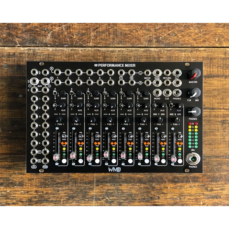 The Performance Mixer is a 40HP 8 channel audio mixer designed specifically for live performance and jam sessions within the modular ecosystem. With 12 audio inputs for the first 6 channels, and 2 true stereo channels, there is plenty of room for all of your modular signals and more.