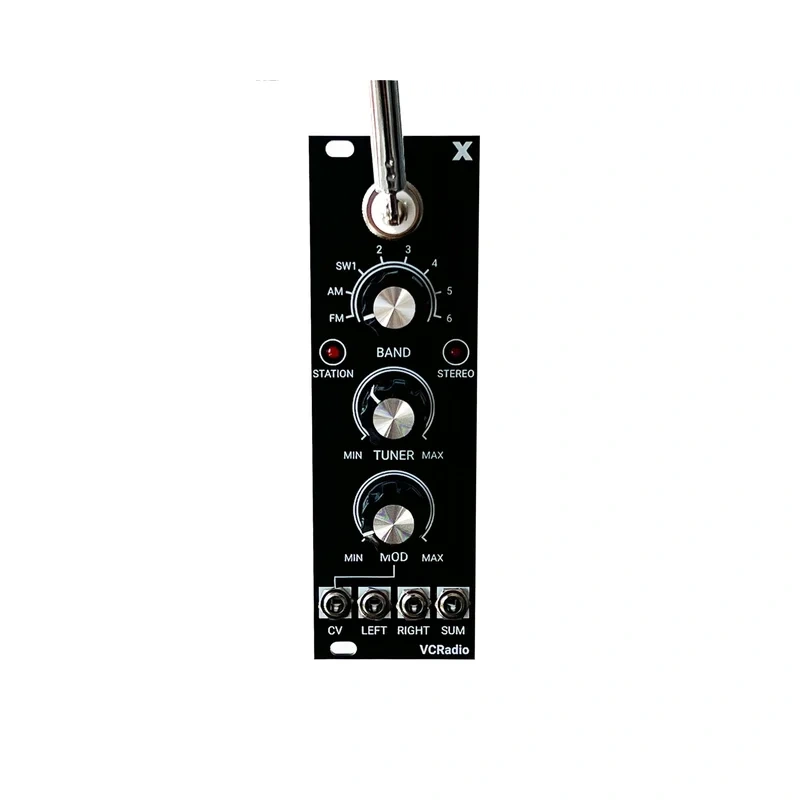 The X Audio Systems VCRadio is an 8HP voltage-controlled FM/AM/SW stereo radio receiver with modulation capabilities.