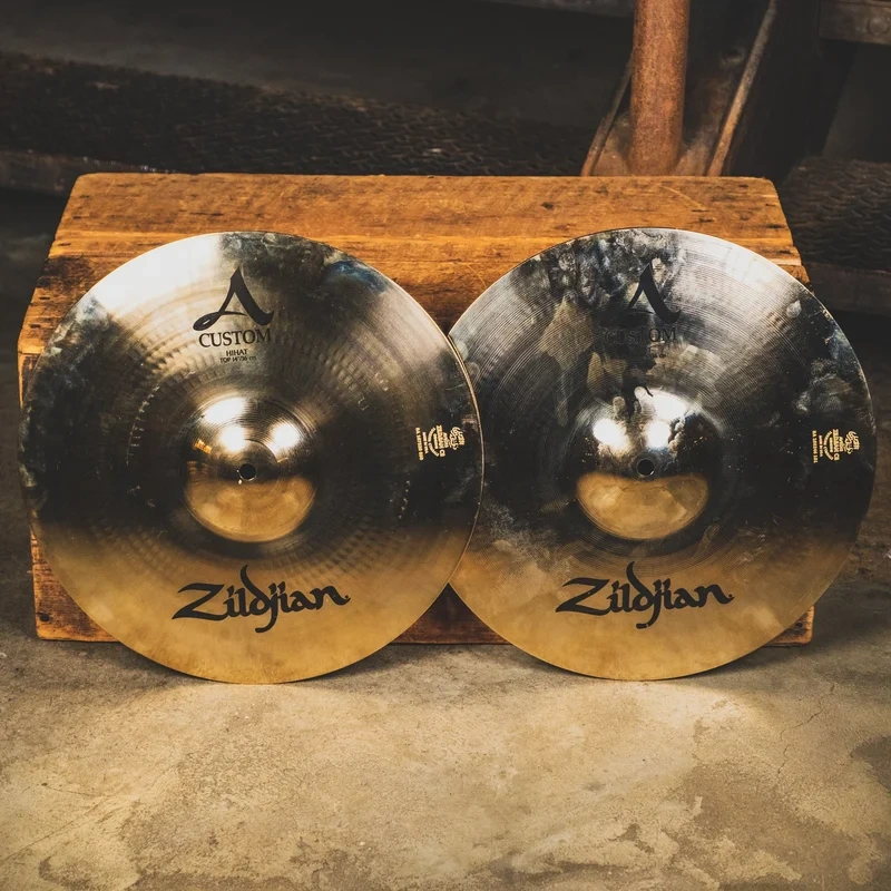 This set of 14" A Custom Hi Hats are in very good condition. They show very few signs of wear and have no cracks or keyholing. This particular set is medium weighted with a brilliant finish. They are relatively loud and bright, which is perfect for louder